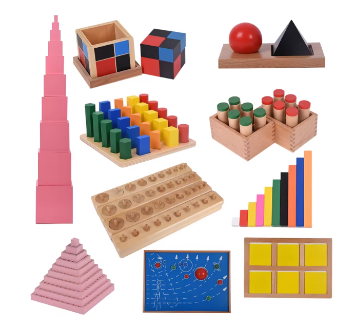 一、感官教具:1、训练儿童各种感官,如视觉、听觉、触觉、嗅觉。2、训练儿童辨别力及手眼协调能力。3、训练儿童观察、分类能力,培养注意力。4、建立几何图形意识,自由拼组。5、培养儿童审美能力。6、培养儿童学习兴趣及求知欲望。包含插座圆柱体,彩色圆柱,长棒,棕色梯,粉红塔等,共23件。