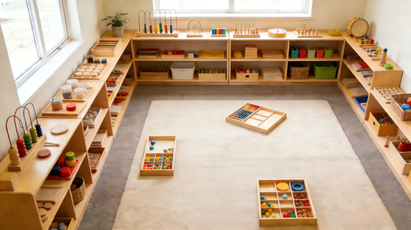遵循幼儿发展规律,采用开放式布局、环保安全材质与自然柔和光线,教具按类摆放于幼儿可自主取放的区域,以简洁环境引导幼儿养成良好习惯,实现“环境即教育”。