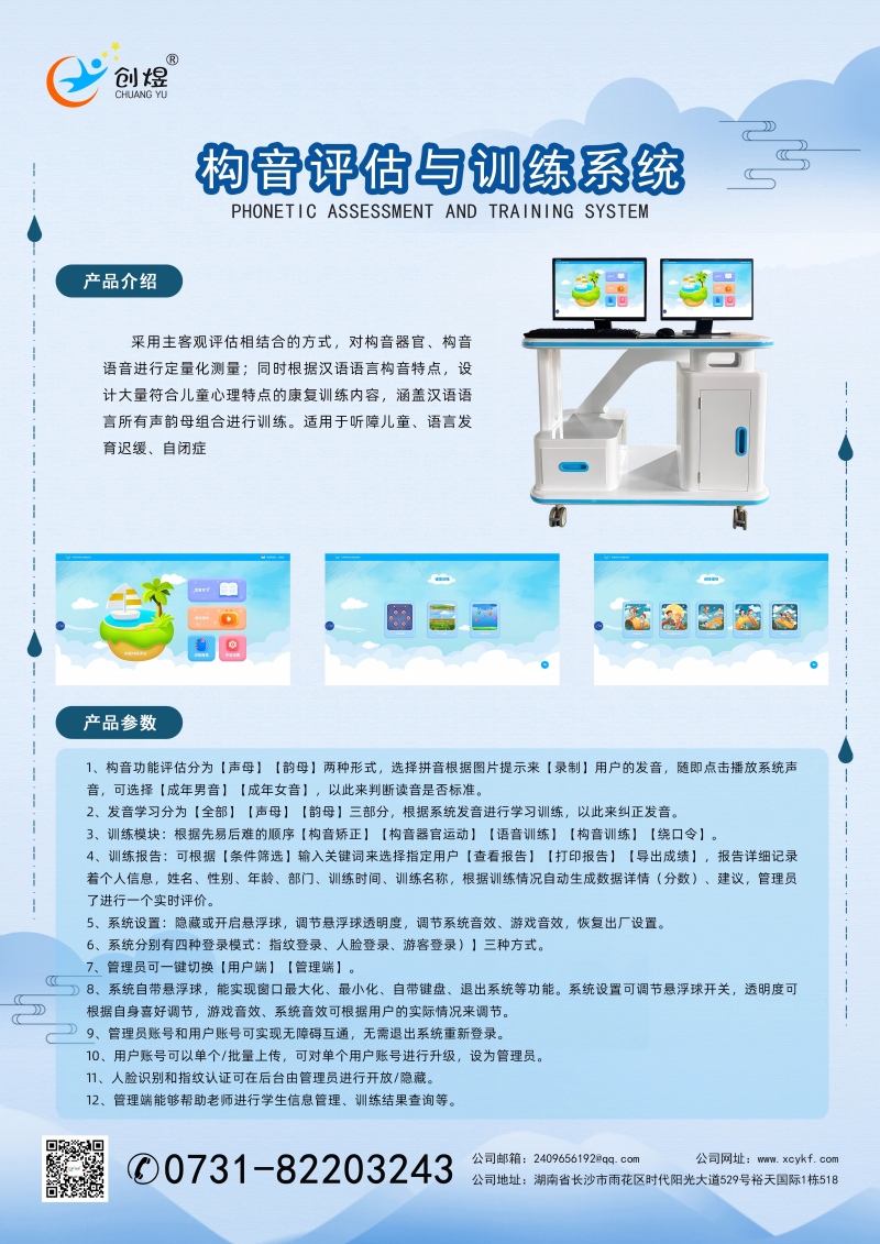 构音评估与训练系统 采用主客观评估相结合的方式,对构音器官、构音语音进行定量化测量;同时根据汉语语言构音特点,设计大量符合儿童心理特点的康复训练内容,涵盖汉语语言所有声韵母组合进行训练。适用于听力障碍、语言发育迟缓、自闭症儿童。