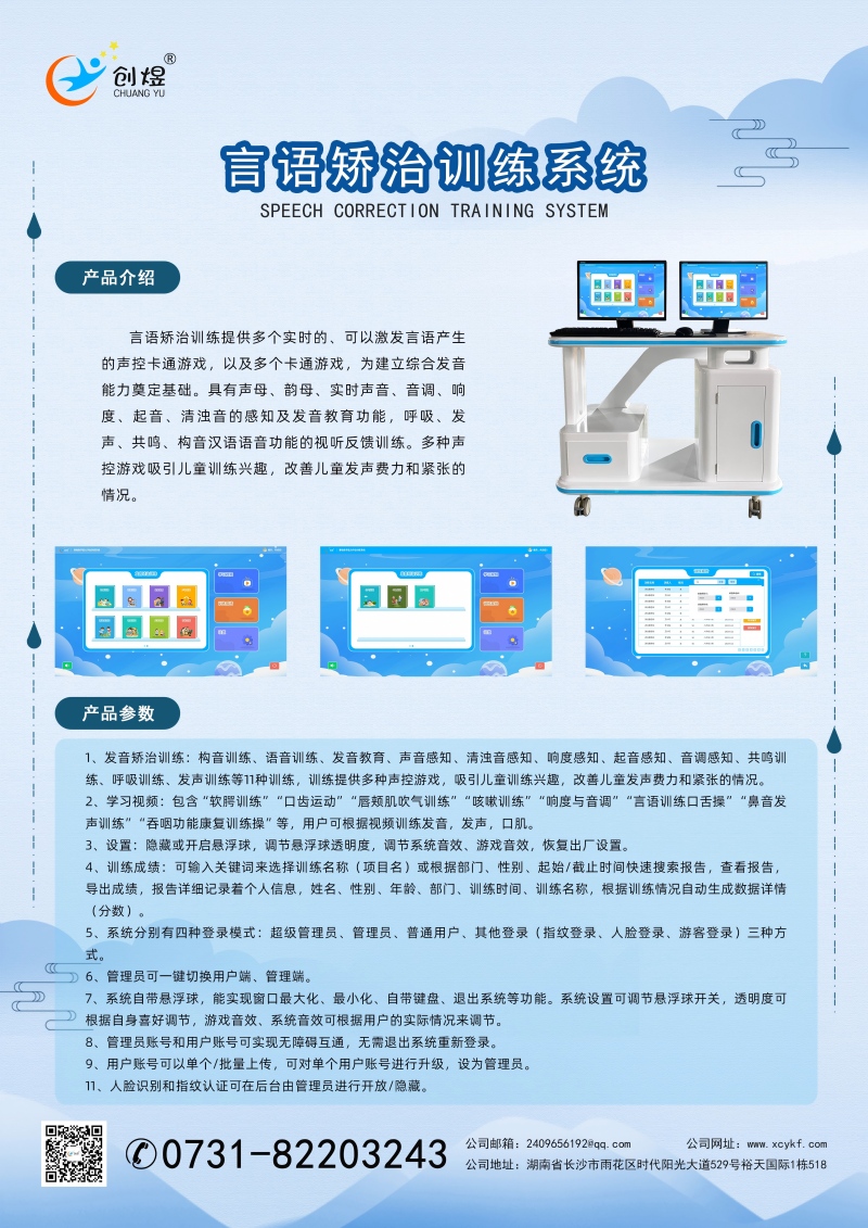言语训练系统提供多个实时的、可以激发言语产生的声控卡通游戏,以及多个卡通游戏,为建立综合发音能力奠定基础。具有声母、韵母、实时声音、音调、响度、起音、清浊音的感知及发音教育功能,呼吸、发声、共鸣、构音汉语语音功能的视听反馈训练。多种声控游戏吸引儿童训练兴趣,改善儿童发声费力和紧张的情况。适用范围:适用于听障儿童、语言发育迟缓、精神发育迟滞、自闭症、脑瘫等各类有构音、语音、言语障碍的特殊人群。